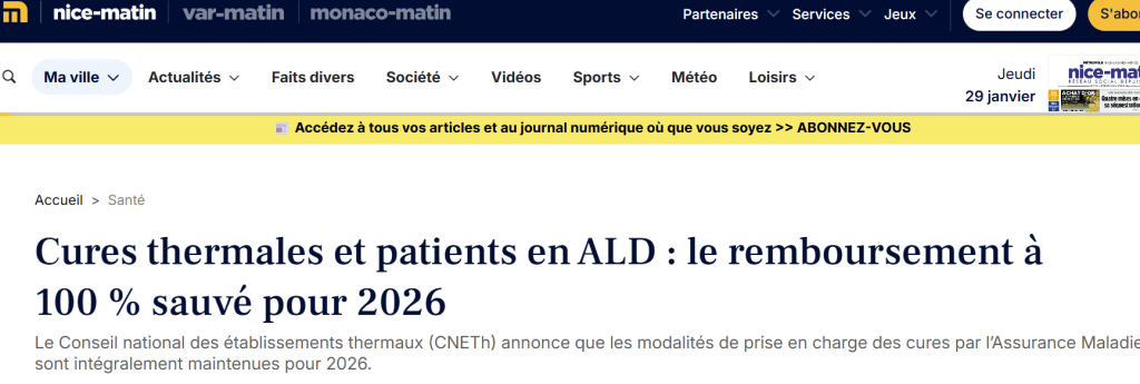 DATE DE PUBLICATION: 30/01/2026 => SUJET ABORDE : Cures thermales et patients en ALD : le remboursement à 100 % sauvé pour 2026